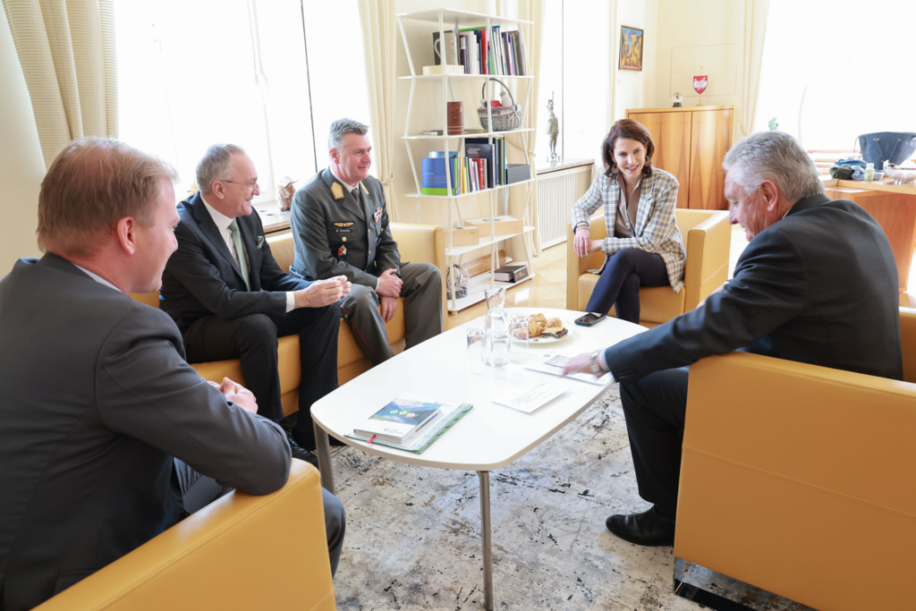 (LK) Die Gesellschaft für Landesverteidigung und Sicherheitspolitik in Salzburg (GLSS) war heute Montag, den 2. März 2026 für ein Arbeitsgespräch bei Landeshauptfrau Karoline Edtstadler. Gesprächsthemen waren die Umfassende Landesverteidigung und die Aufwertung des Militärstandortes Salzburg.